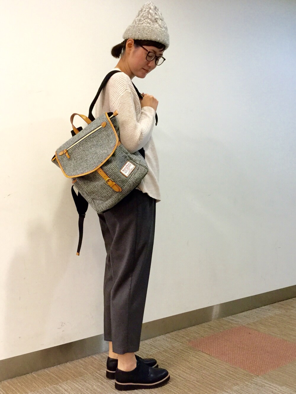 今日の主役はハリスツイードのリュック! お洋服はシンプルにまとめました。 グレーのペグパンツはゆったりとしていて動きやすく、トレンド感も盛り込まれた優秀なアイテム! シンプルだけど小物を効かせたスタイルにしました。