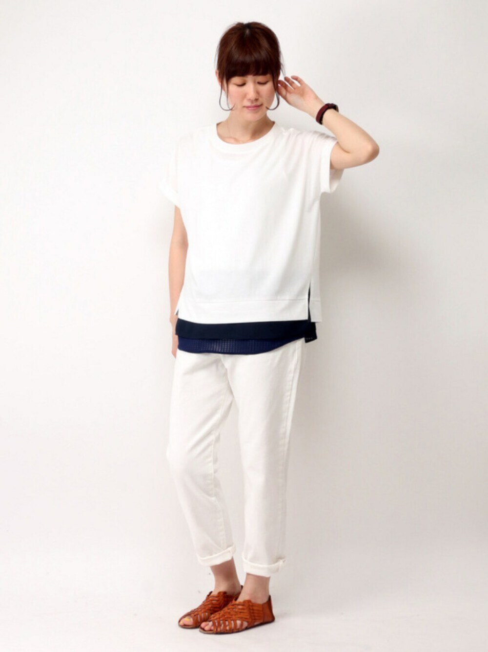 タンクセットのカラー違いです。 オールホワイト×ややネイビー。裾がネイビーなので、ボトムをダークなカラーにするよりは明るいカラーにすることで遠くから見た時に自然に見えるようにしました。