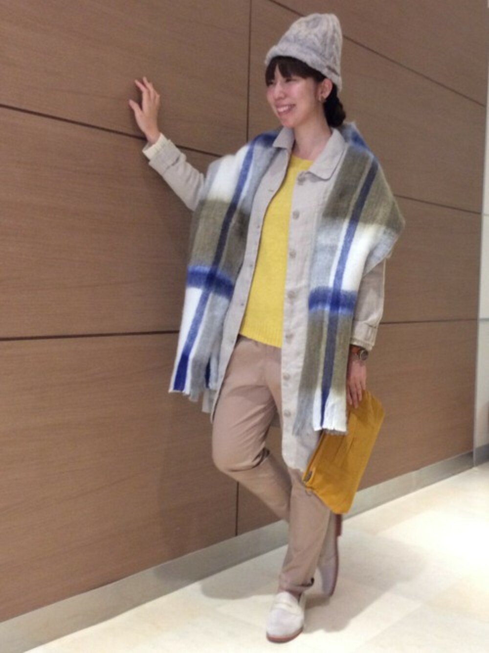 ベージュカラーを軸にイエロー、ぶるーを効かせたカラーコーディネートです。 シェットランドニットはボディーと袖の色切り替えがポイント。 大判サイズのストールはリバーシブルで使い勝手バツグンです。