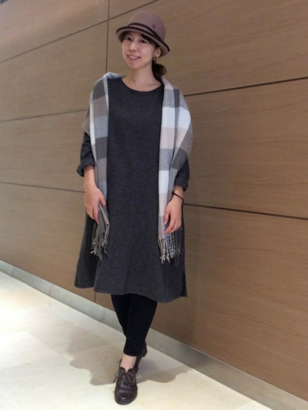 起毛したへリンボン素材が冬らしい印象のワンピース。 同系色でまとめたスタイリングにチェック柄ストールをアクセントで加えました。 ストールはリバーシブルタイプで使い勝手バツグンです。