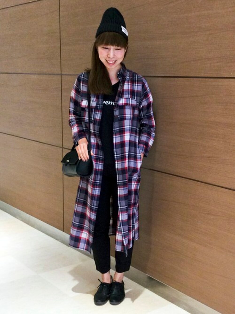 ブラックコーディネートに秋に人気のチェック柄をプラスしました♪ ロング丈が今年らしいシャツワンピースは、軽めのアウターとして秋に活躍するアイテムです。 インは、シンプルなロゴTシャツとスリムタイプのボトムでスッキリとしたスタイリングに。