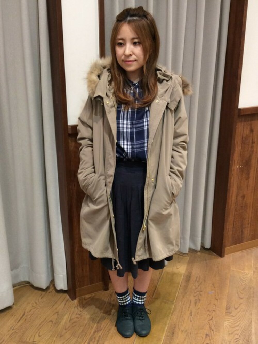つなっしーのモッズコート「グログランピーチモッズコート」を使ったコーディネート