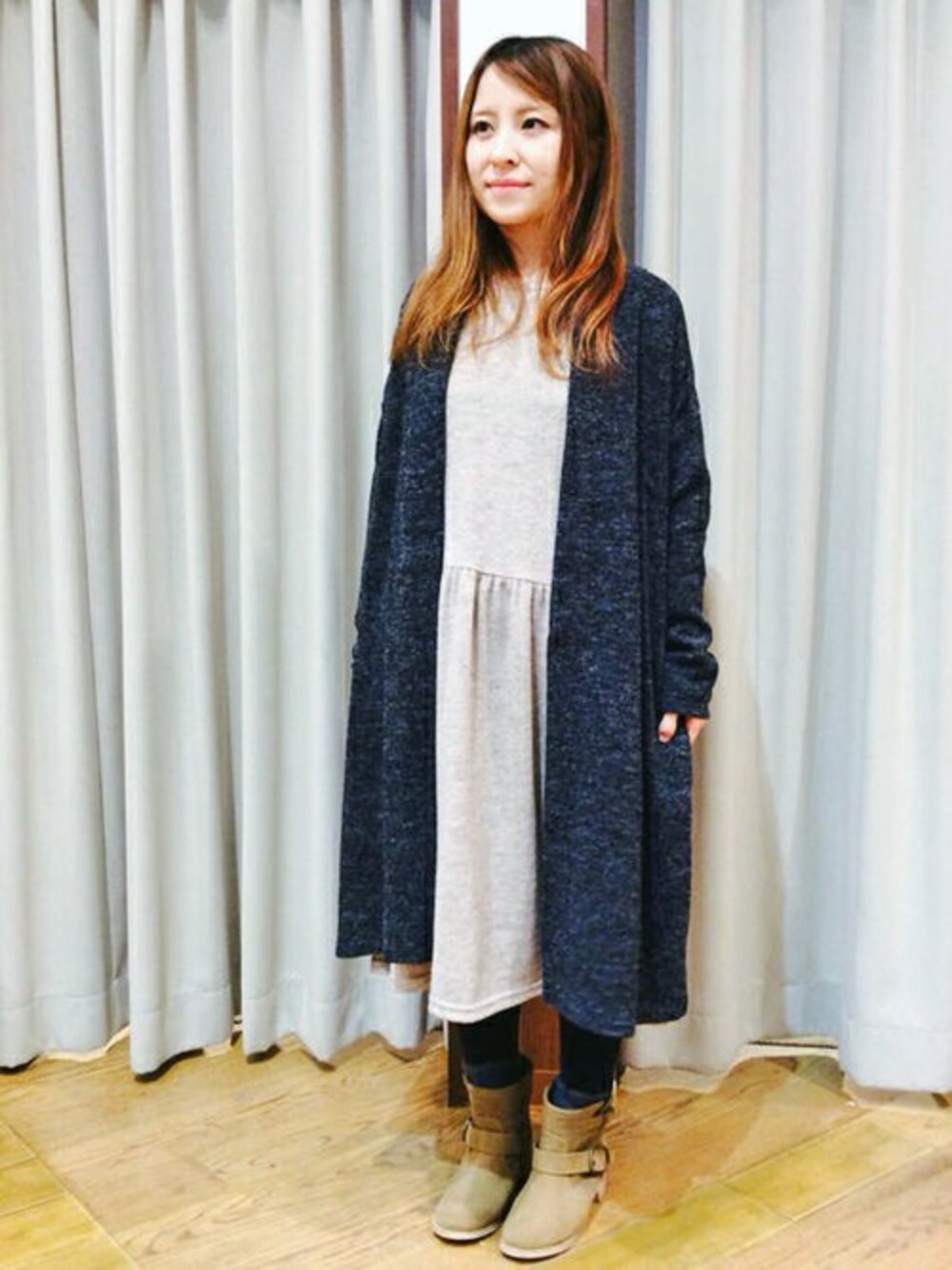ロングカーディガン×ワンピースのリクッラスコーディネート。 緩い雰囲気のコーデにはエンジニアブーツを合わせてバランスをとります。 ロングカーディガンはワンピにもパンツにも合わせやすく、レーヨンも配合されていますので手触りも良いアイテムです。