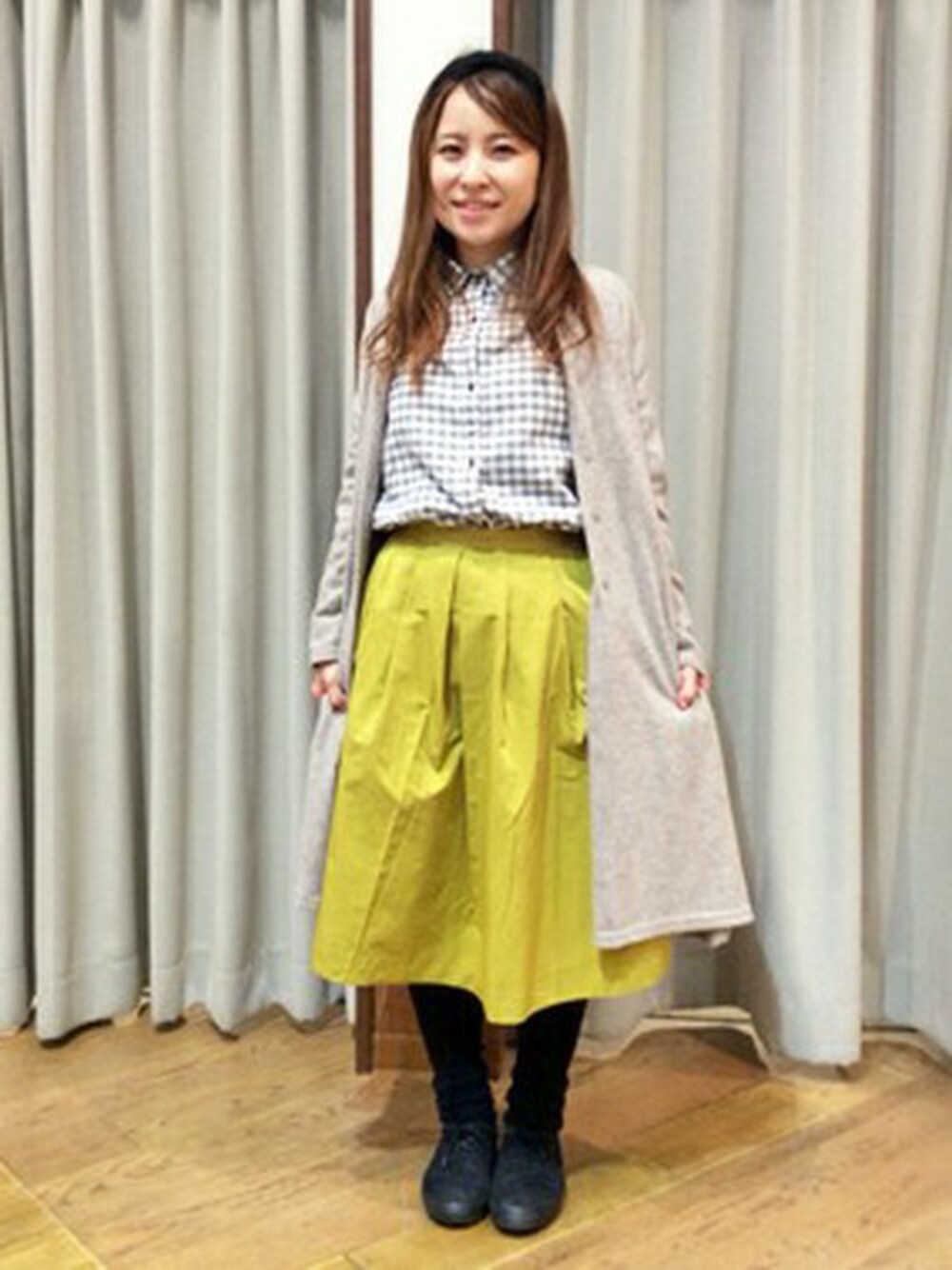 鮮やかなイエローのスカート。 ギンガムチェックのシャツを合わせて春コーデの完成です。 暖かい日のアウターはカーディガンがおすすめ♪ 今年はアウターと同じくロング丈がトレンドですね。