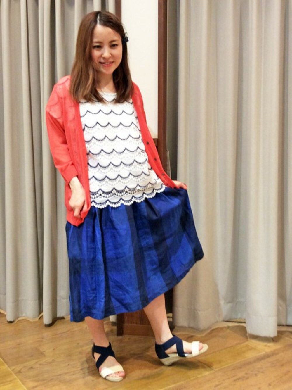 トレンドのシロ×ブルーにアカをきかせた、おでかけコーディネートです。 同系色の大きなチェック柄がかわいいふんわりスカートには、ショート丈のトップスを合わせて♪ カーデは、UV加工&さらりとした肌触りで、暑い夏に大活躍しそうです。