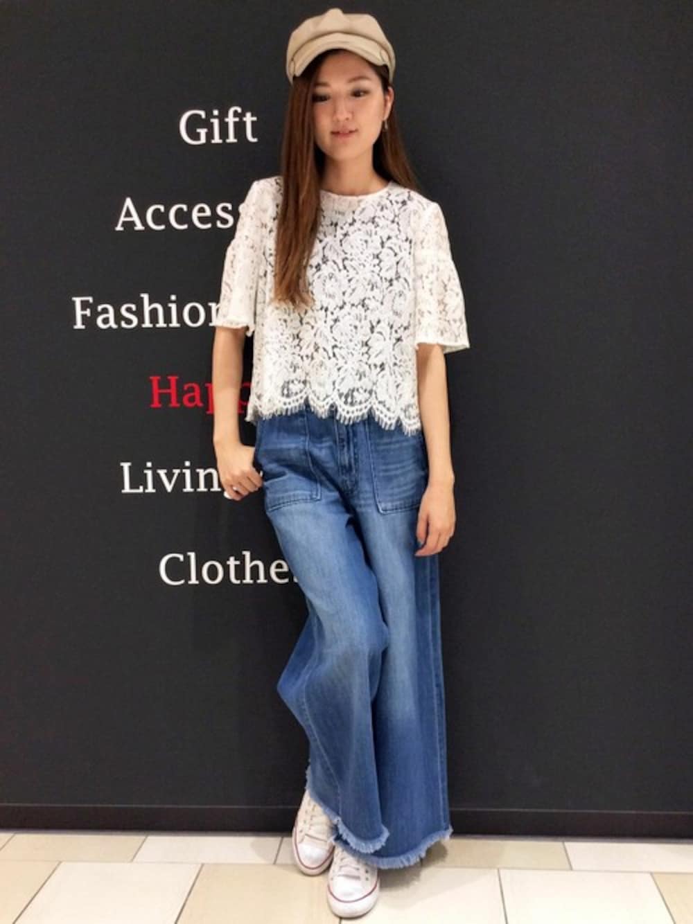 大人の女性らしいデニムスタイル。 トップスは、この時期一枚はクローゼットに揃えたい総レースのブラウス。 ボタニカルなレース模様が他と違うポイントで、ナチュラルな可愛さを楽しめるデザイン♪ ボトムやコモノは少しメンズテイストをプラスすると全体が甘くなり過ぎずおすすめです。