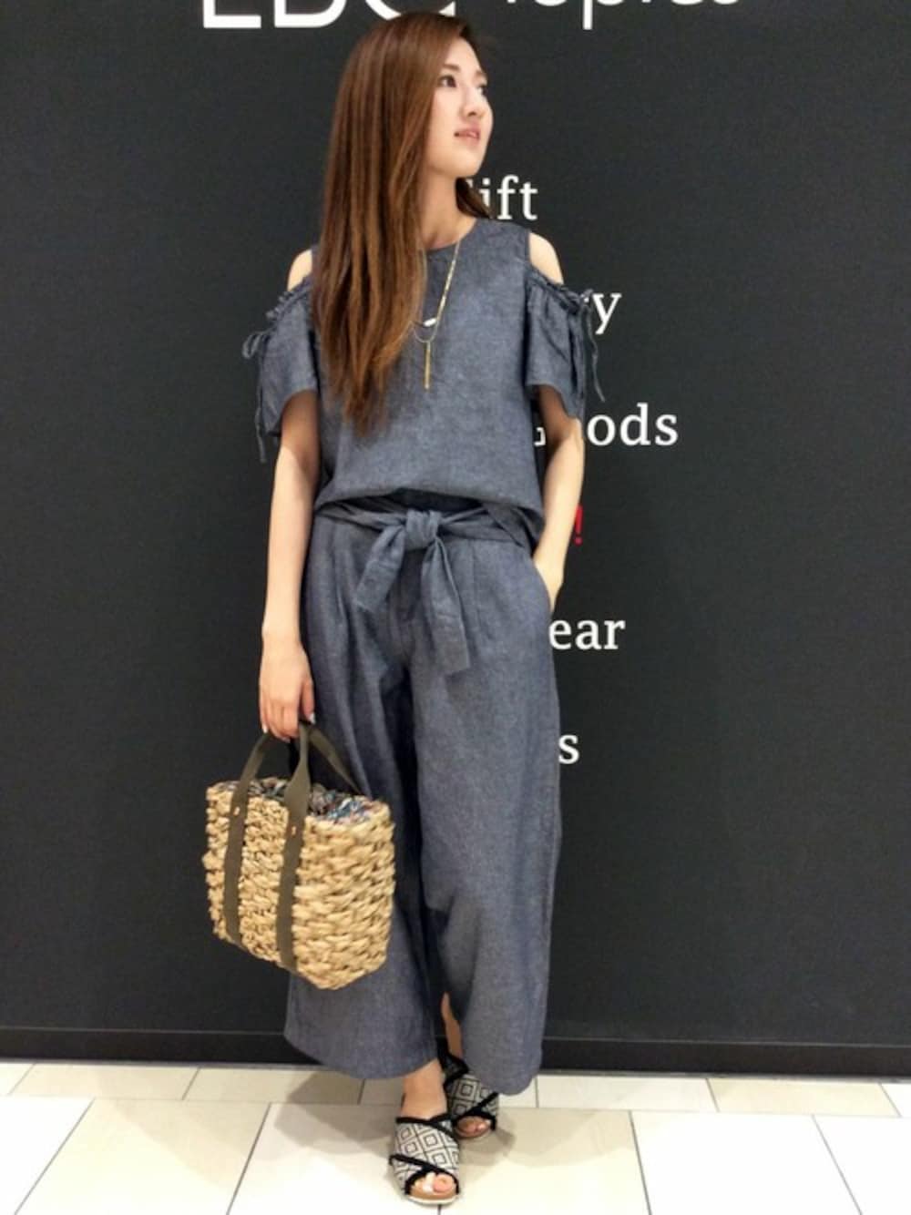 夏のセットアップスタイルです。 今っぽさはもちろん、着やせにも一役買ってくれる肩見せブラウスに、トレンドのウエストマークデザインのパンツの上下。 セットはもちろん、単品でもコーディネートしやすいのもポイントです♪