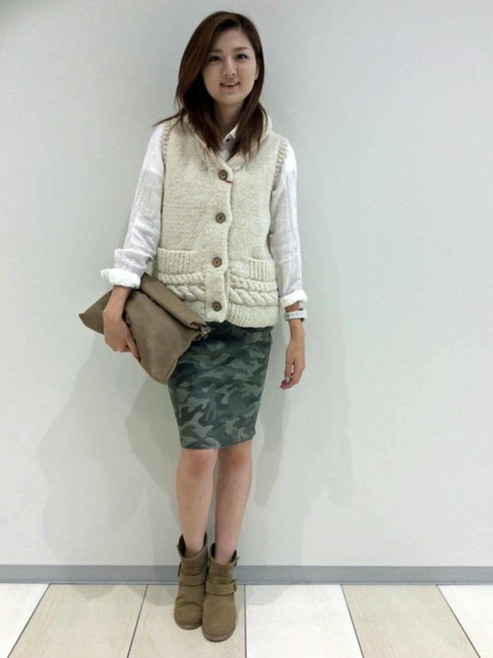 ニットベストは手編み特有のぬくもりがあり、なんだか着ると気持ちもホクホク♪ 大人気のカモフラスカートとも相性バッチリですね。