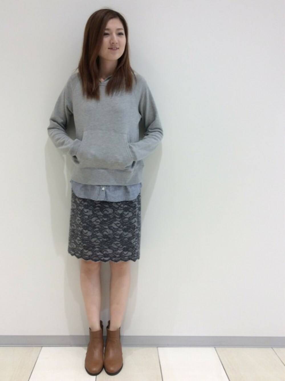 パーカーから見えるシャツ、実はフェイクでパーカーにドッキングしています。 なので迷うことなくコーディネートが出来上がります。 あわせたタイトスカートがおとなっぽいレース使いが特徴。 カジュアル使いの他にもブラウスとあわせればオンスタイルにもご利用いただけます。