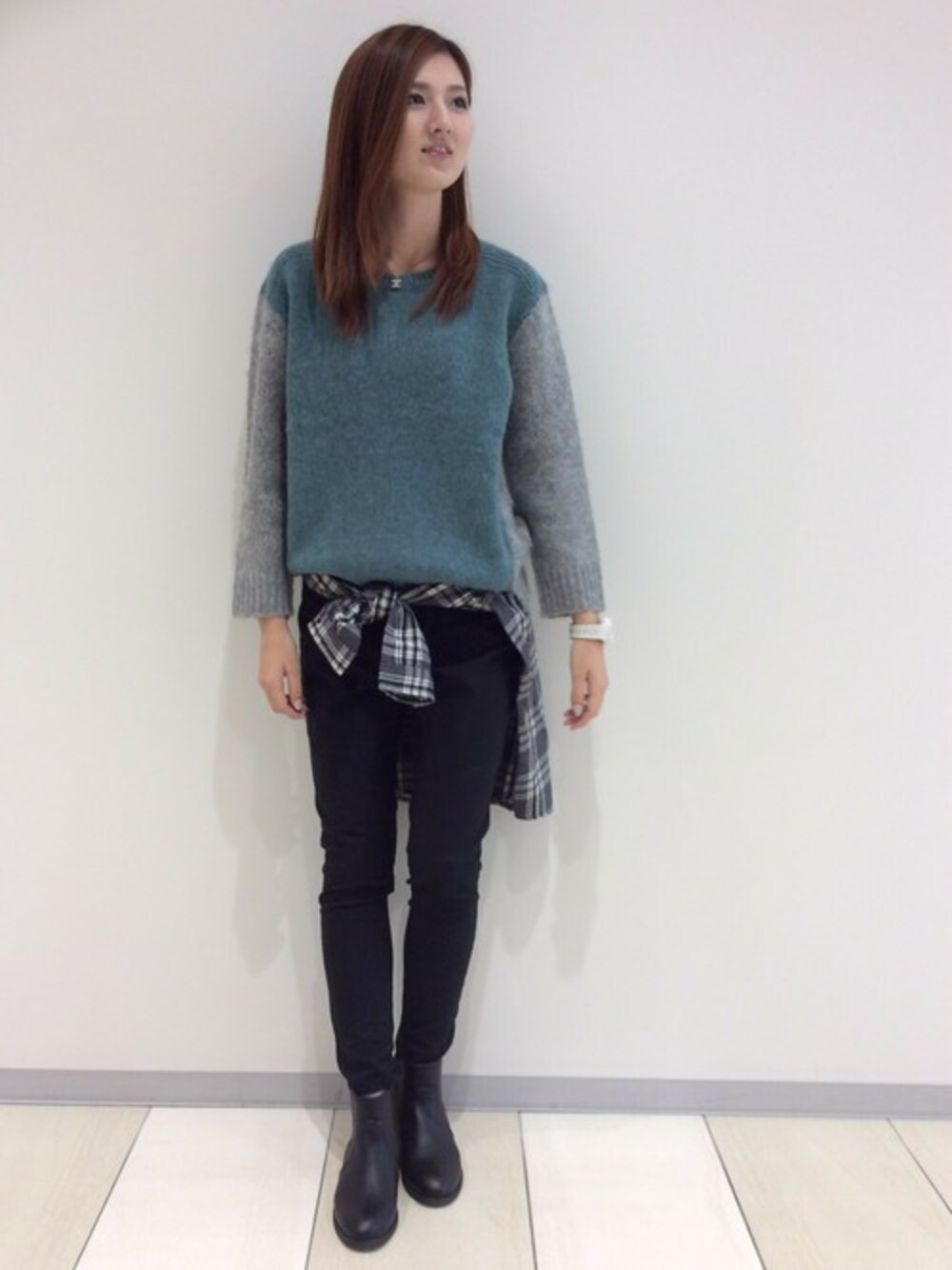 バイカラーの配色が可愛いニットはウール100%であったか。 ジャストサイズなので、オンオフどちらでもご利用できます。 今日は腰巻きでカジュアルダウンさせたコーディネートです。