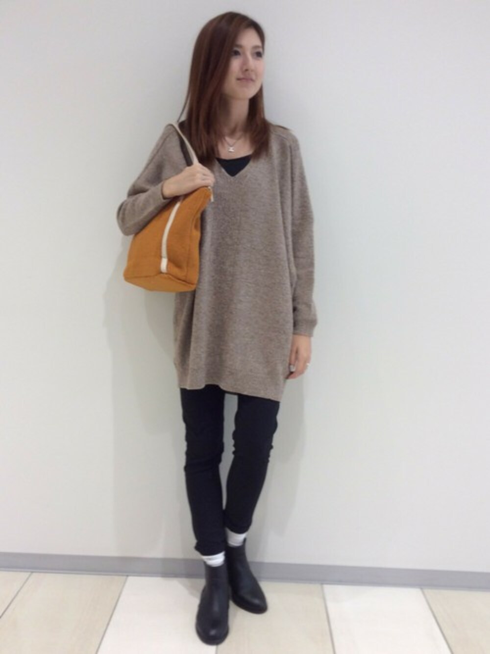 BIGシルエットのゆるニットは落ち感があり女性らしさを演出します。 オーバーサイズのトップスにはスリムパンツ合わせがおすすめ♪ ソックスをチラ見せさせてトレンドをちょっぴり取り入れました。