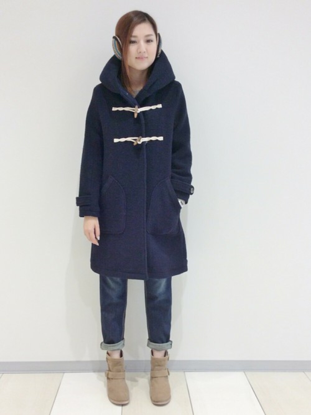今季LBCのダッフルコートはスライバー素材です! スライバーとは毛足が長くボリュームがあるのに、軽くて暖かいのが特徴。 フードも大きめで、マフラーしなくても暖か♪ デニムと合わせてワントーンコーディネートにまとめました。 イヤマフラーのジャガード柄をちょっぴりアクセントに使いました。