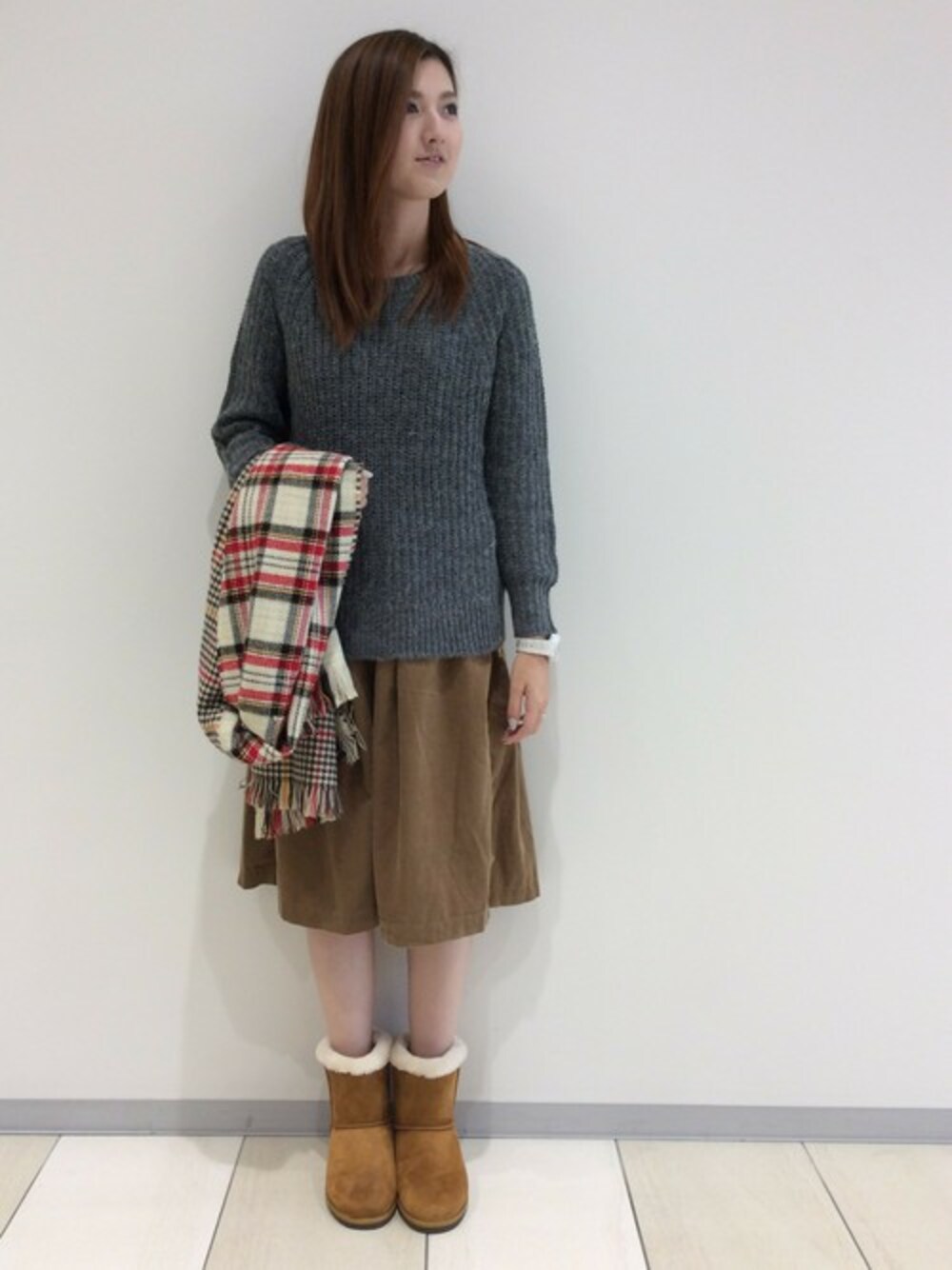 一見シンプルなニットは裾にZIPを施したちょっぴりきれい目なアイテム。 コーデュロイのスカート合わせで今年らしい着こなしに♪ ムートンブーツはインヒールで足長見せできる優秀アイテムです。