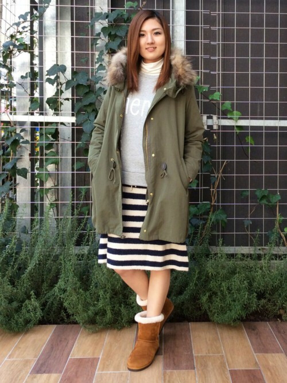 毎年人気のモッズコートを中心にカジュアルコーデ♪ このモッズコート、裏地が取り外せ3シーズン着れちゃうんです。シルエットがすっきりしているのでボトムスを選ばないのも魅力的♪ インナーにはタートルネックにロゴプリントがアクセントのトレーナーでレイヤードスタイル。裏起毛なのも◎ スカートはトレンドのミモレ丈のボーダーニットスカート。カジュアルコーデに上品さもプラス♪ 足元にはモッズコートと相性抜群のブラウンのムートンブーツでまとめました。