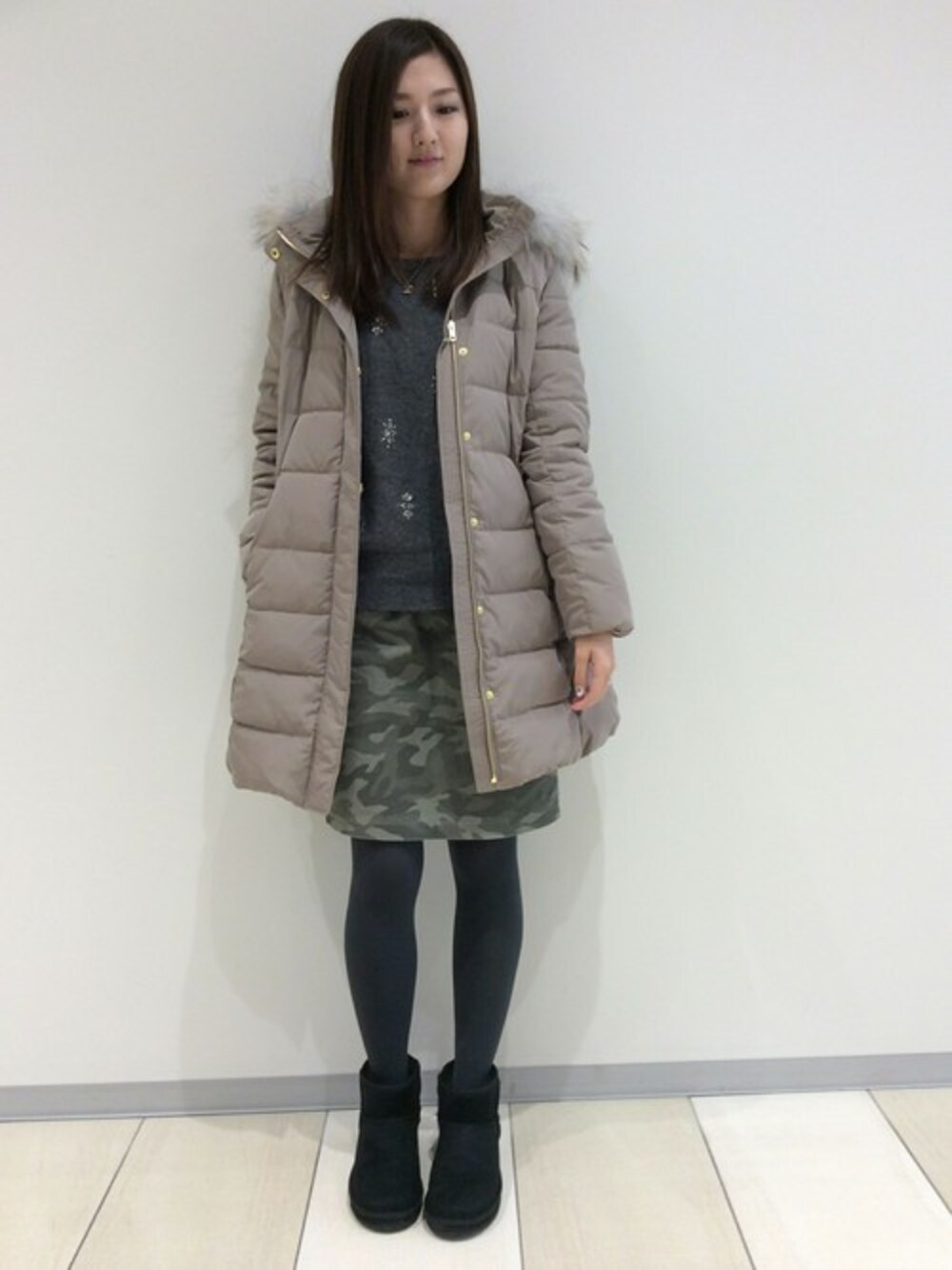 美シルエットのロングコートとビジューをあしらったニットが好相性なコーディネート。 きれい目な2アイテムにカモフラスカートとムートンブーツを合わせてミックスカジュアルなスタイリングに。 色はグレーのトーンコーデでおとなな印象にまとめました。