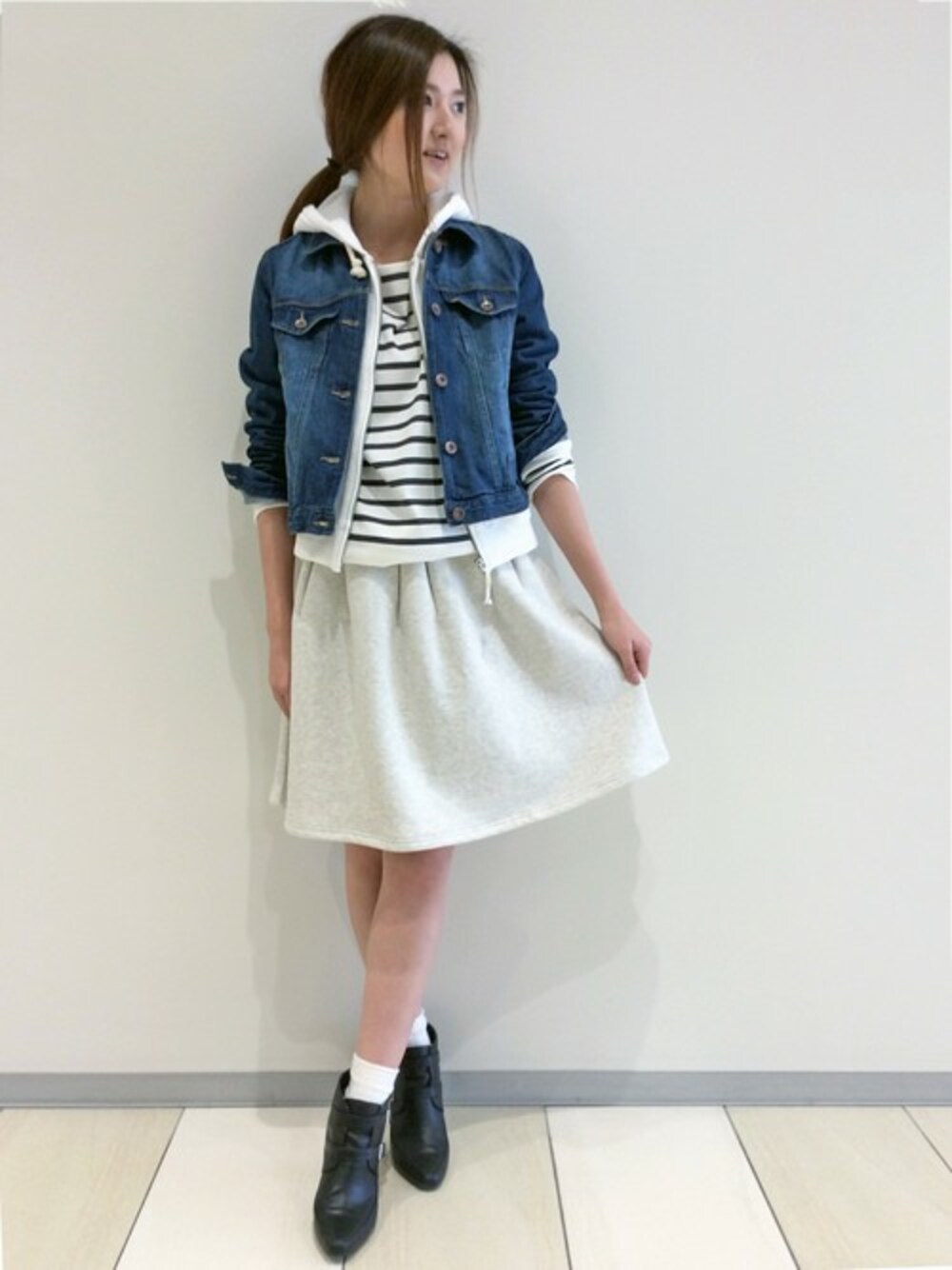 春感じるGジャンコーデディネート。 淡いカラーのスウェットアイテムで軽さを演出しました。 中にボーダーのカットソーを着ると一気に春気分♪ スカートを合わせてガーリーにまとめました。