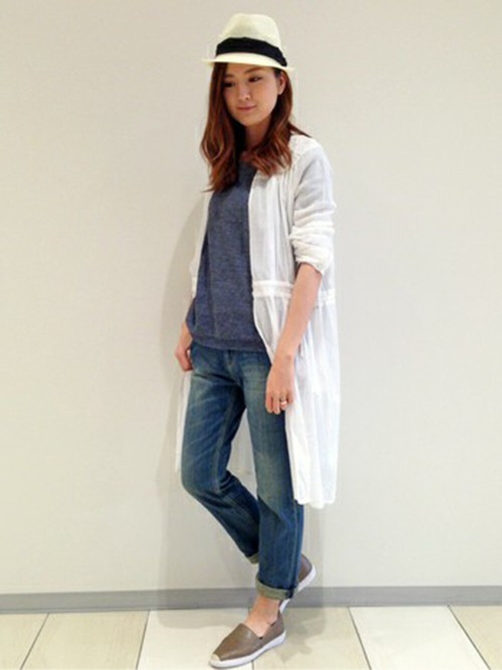 ワンピースを前空きでコートとして羽織ったコーディネート。 もちろんワンピースとしても使えます。 トレンドのデニムパンツにスリッポン+中折れハットと、これからの季節を意識したスタイリング♪