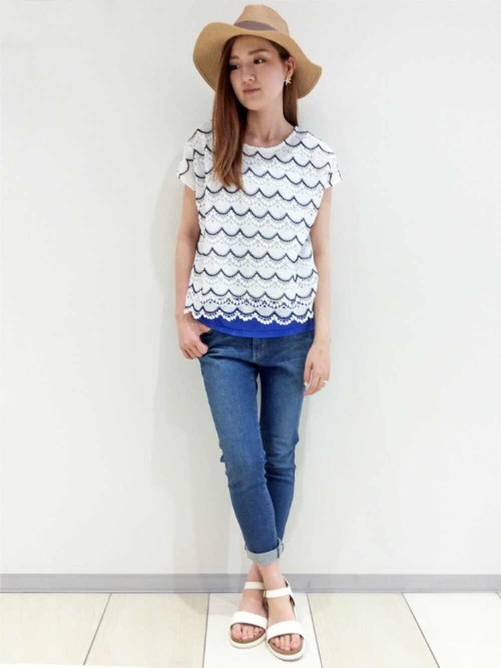 夏のデニムコーデ。 なみなみボーダーデザインのレースカットソーをあわせて、きれいめにまとめました。 鮮やかなブルーのタンクトップをチラ見せすると全体のアクセントになります♪