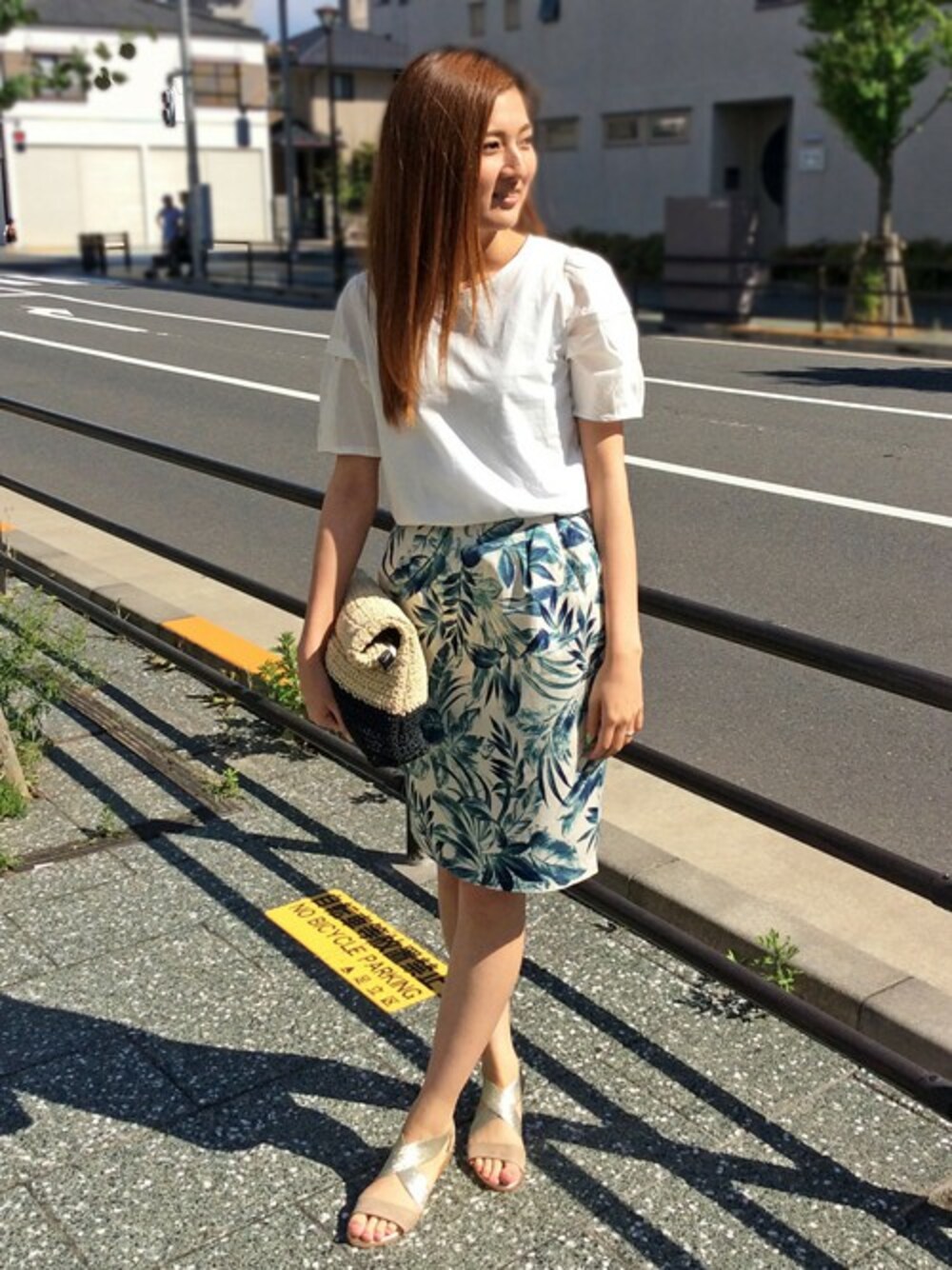 大人の女性らしいタイトシルエットなスカートコーディネート。 トレンドのボタニカル柄をちりばめたスカートは、着るだけで夏気分を盛り上げてくれます♪ 袖のツイストがポイントのブラウスとあわせて、きれいめにまとめました。