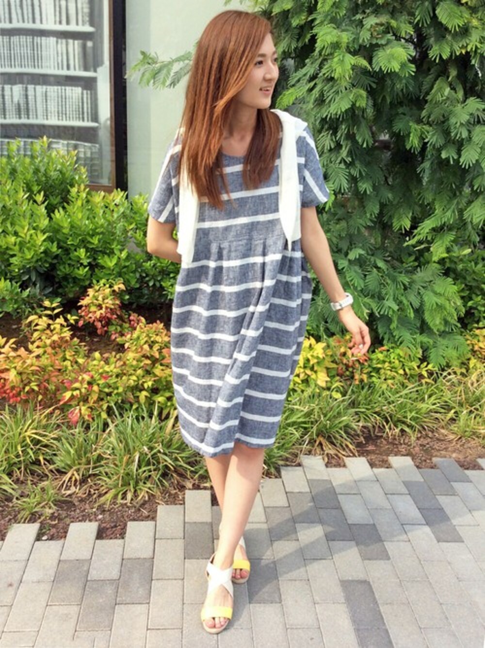 涼しげなワンピーススタイル♪ シルエットのかわいいボーダーワンピースは、コットンリネン素材で暑い季節にもさらりと着れます。 白カーデを肩掛けすると爽やかな印象になります。