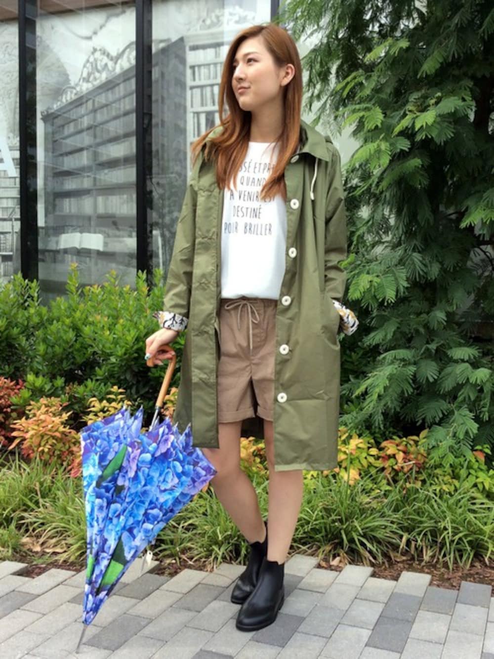 雨の日におすすめのコーディネートです。 カーキのレインコートは、内側の花柄がポイントになっています。 アースカラーのスタイリングを、ブラックのレインブーツでピリッとひきしめました♪