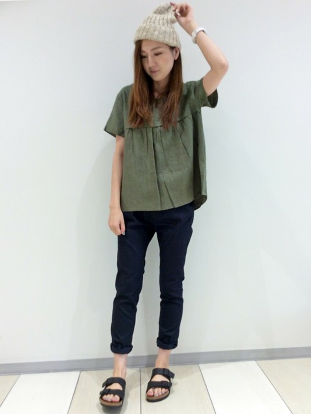 トレンドのカーキを取りいれたパンツスタイルです。 トップスは、シンプルにみえて胸元の切替や後ろさがりなどシルエットにこだわった一枚。 短すぎず長すぎずでパンツはもちろん、スカートとの相性も◎です。 ニットワッチで少し秋を取り入れてみました♪