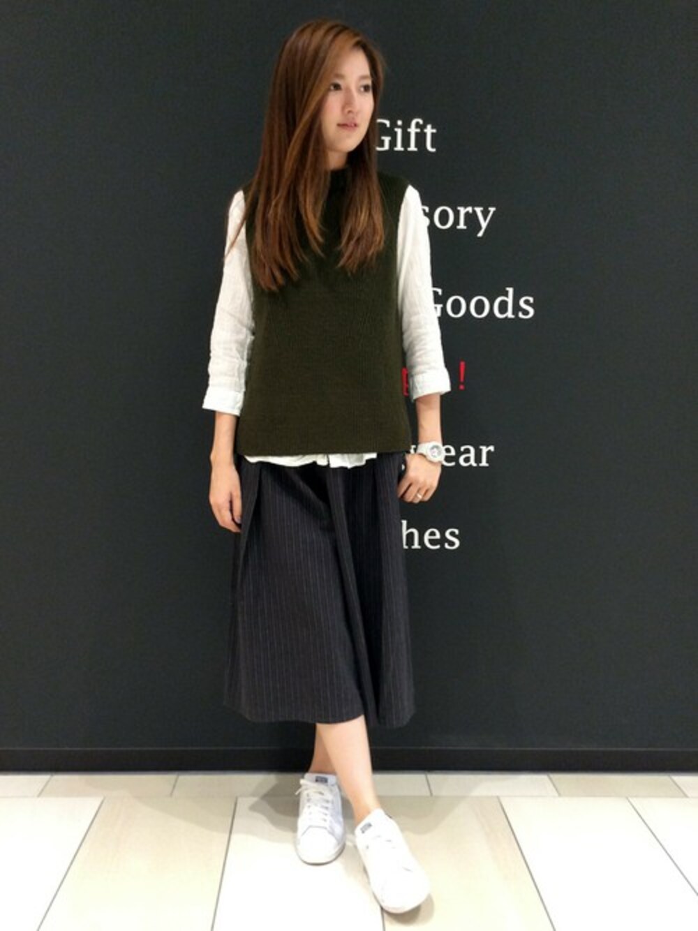 あったかベストをとりいれた秋のコーディネートです。 秋冬トレンドのハイネックデザインのベストは、一枚はもちろん、レイヤードスタイルも楽しめる一枚。 丈もちょうどよくパンツスカートどちらでもあわせられます。 トレンドのガウチョパンツとあわせて大人っぽい雰囲気にしてみました♪ 足元は、スニーカーではずすのが今年のおすすめです。