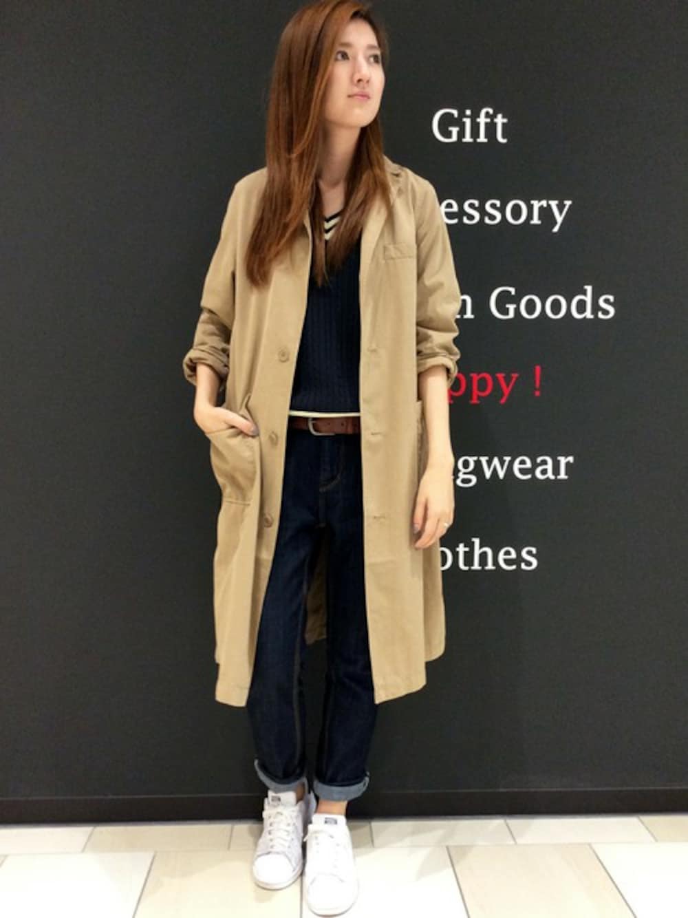 秋のコート×デニムコーディネートです。 メンズライクなチェスターコートは、トレンドのロング丈で今年らしさ◎ やわらかな素材なので、ストンとしたきれいなIラインのシルエットです。 インは、この秋注目のチルデンニット。Vネックとライン使いが首まわりをきれいに見せてくれます。 デニム&スニーカーでカジュアルに♪
