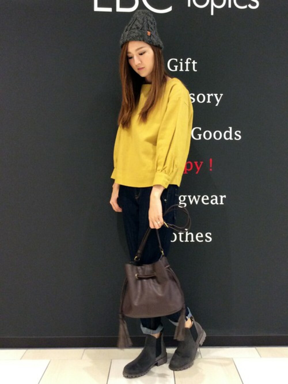 秋カラーのトップスが上品な大人カジュアルコーディネートです。 マスタードのブラウスは、ボートネックと程よいボリューム袖が女性らしい雰囲気。 今回は、デニム&ニット帽でカジュアルダウンスタイルしました。 スカートとあわせると、きれいめスタイルに♪コーディネートの幅の広いおすすめアイテムです。