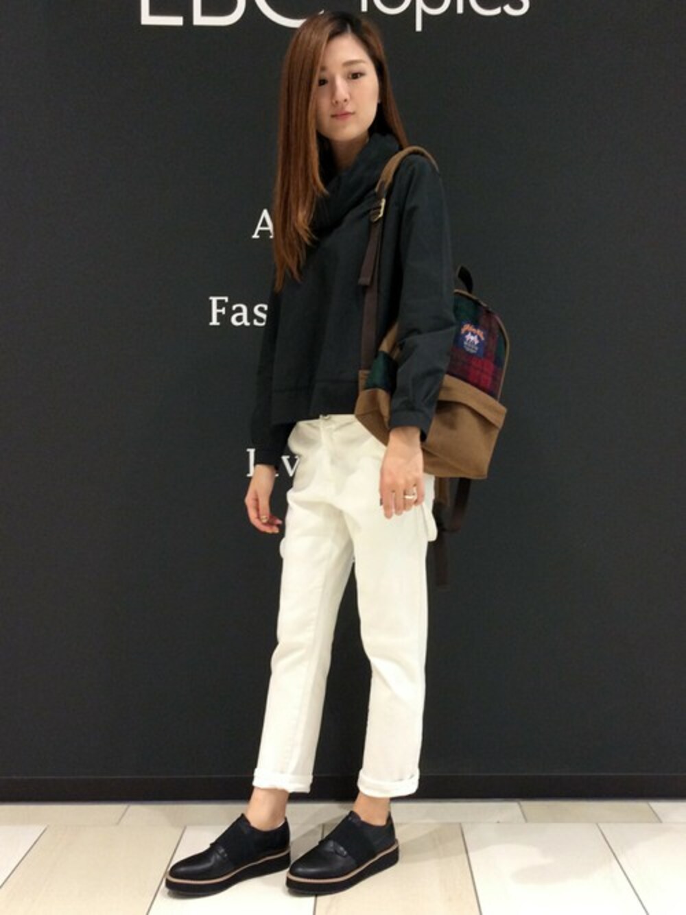 モノトーンでまとめたオトナカジュアルスタイル。 トップスは、トレンドのボリュームネックタイプのブラウス。シンプルながらも存在感のある一枚です。 パンツは、サスペンダー付。細いタイプのサスペンダーなので、子供っぽくならずこなれ感をプラスしてくれます。 上質なツイード素材をつかったリュックは、大人の女性らしいカジュアルミックスが楽しめます♪