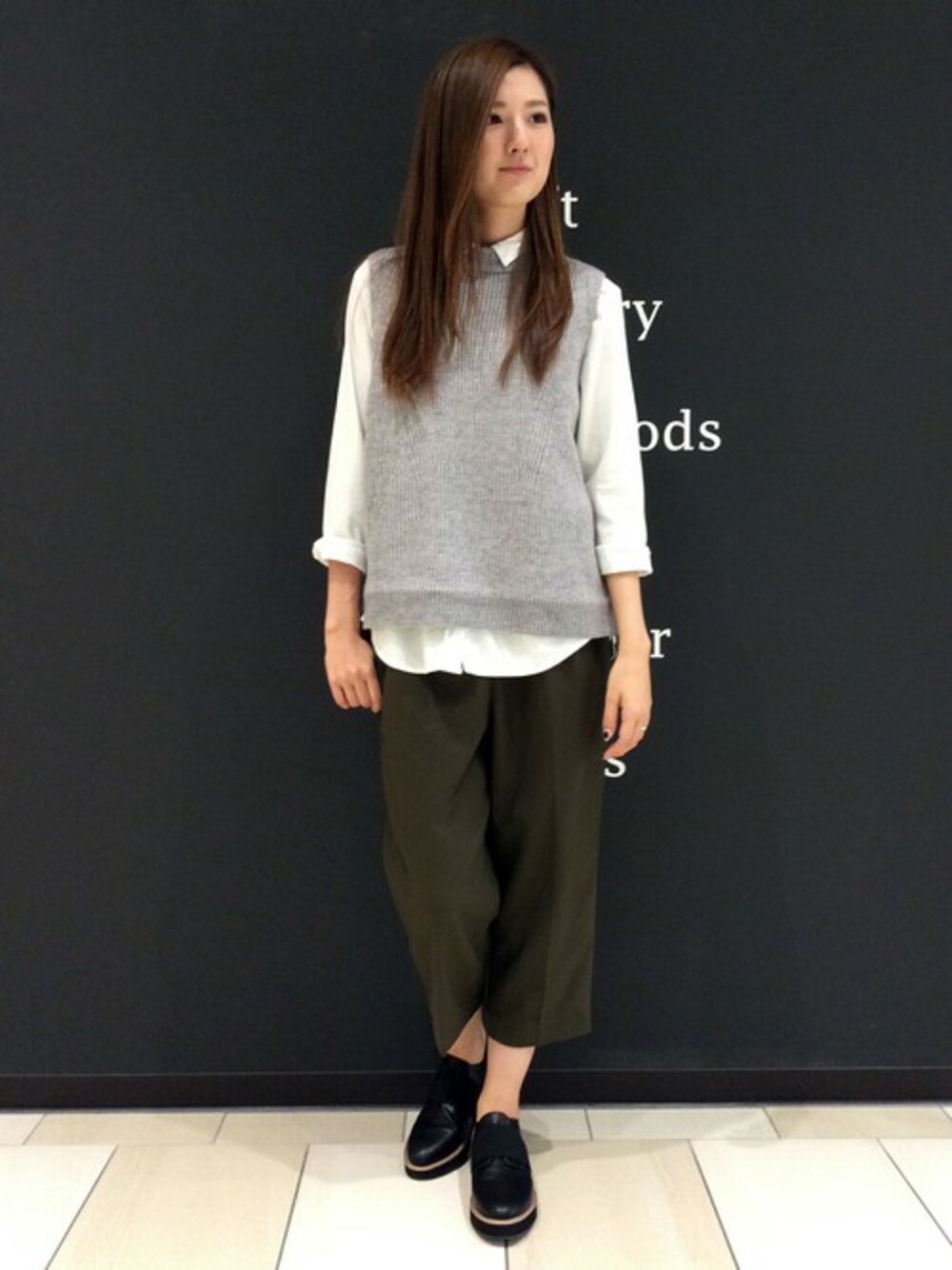 この秋人気のベストをつかったオトナカジュアルコーディネートです。 トップスは、今年らしくシャツとあわせてレイヤードスタイルに。 ボトムは、トレンドのワイドパンツ。クロップド丈なので、足首みせでスタイルアップ効果が狙えます。 これからのシーズンはブーツあわせもおすすめです♪