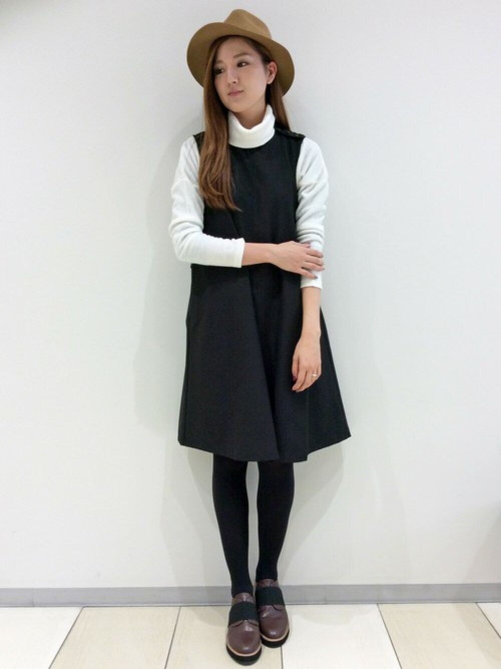 大人の女性らしい雰囲気のモノトーンコーディネートです。 ワンピースは、肩にボタンがあるのと、後ろにトレンチコートのようなベルトがついているのがポイント。 シンプルにみえてディティールのこったデザインで、ちょっとしたおでかけにもおすすめです。 インナーはタートルネックを合わせると今年らしさがUPします♪ 小物はあえてメンズライクなハットのマニッシュシューズで。