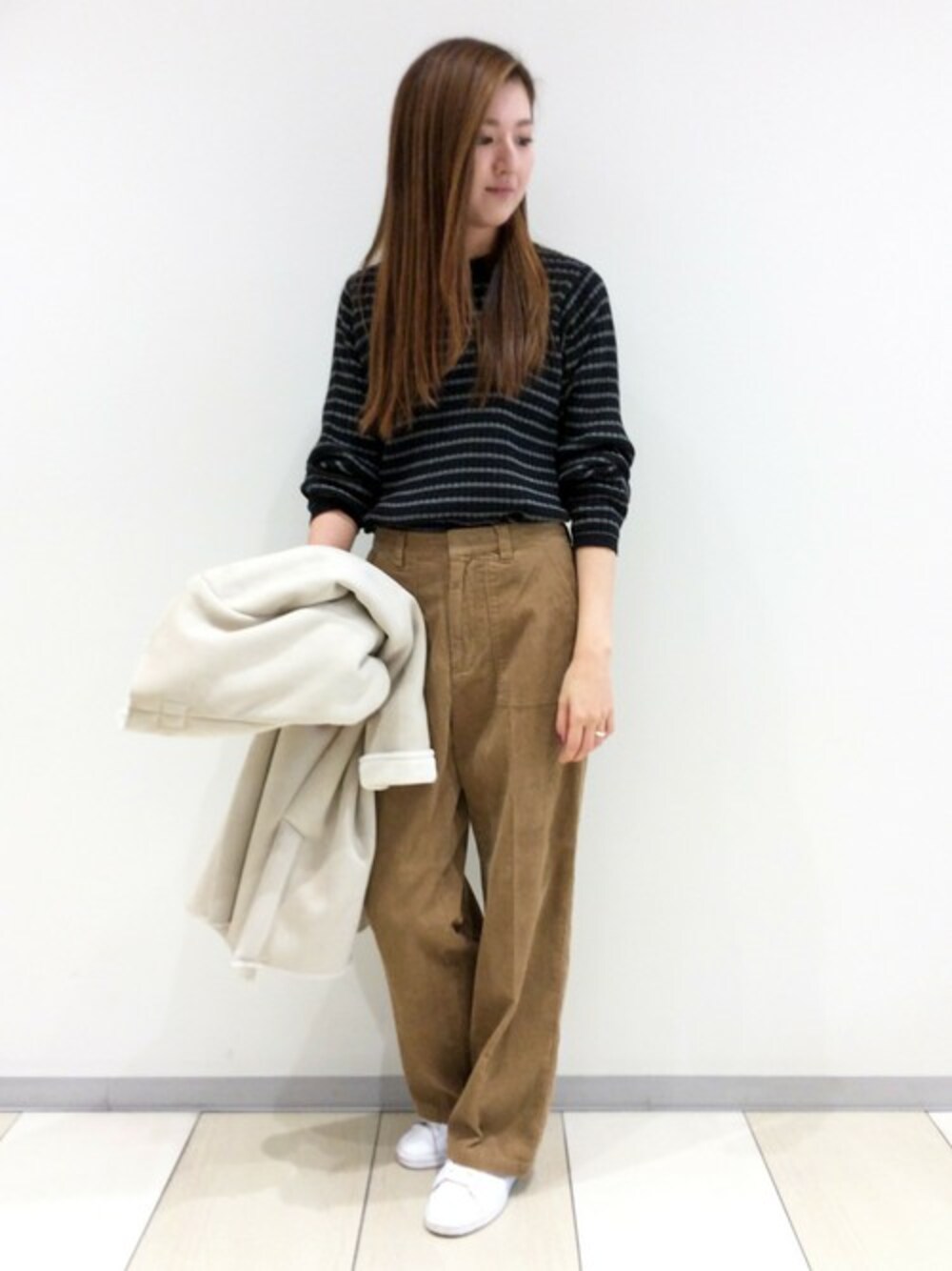 これからのシーズンにぴったりのオトナカジュアルコーディネートです。 メインは、トレンドのワイドパンツ。センタープレスが入っているのでスラッと綺麗なシルエットです。 コーディロイのあたたかみも◎ トップスは、ハイネックのボーダーニットをあわせてカジュアルに。 ウェストインで脚長効果がねらえます♪
