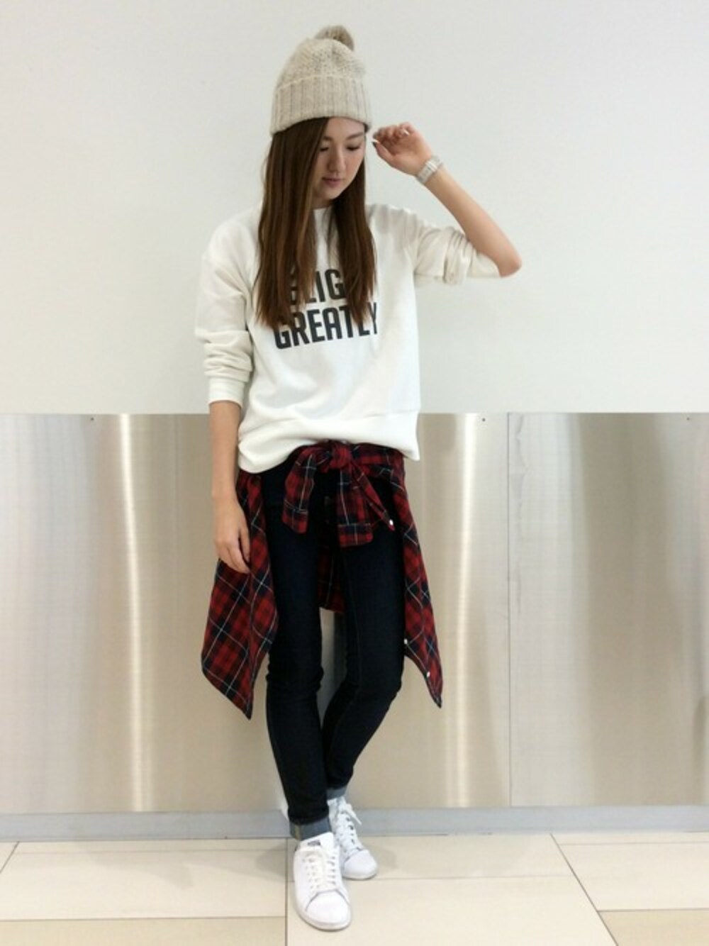 ラフなデニム×スニーカーコーデ。 トップスはシンプルなロゴのスウェット。太いリブと程よい丈感がポイントになっています。 シンプルなコーディネートのときは、ニット帽や腰巻きなどをプラスするとこなれた雰囲気になります♪