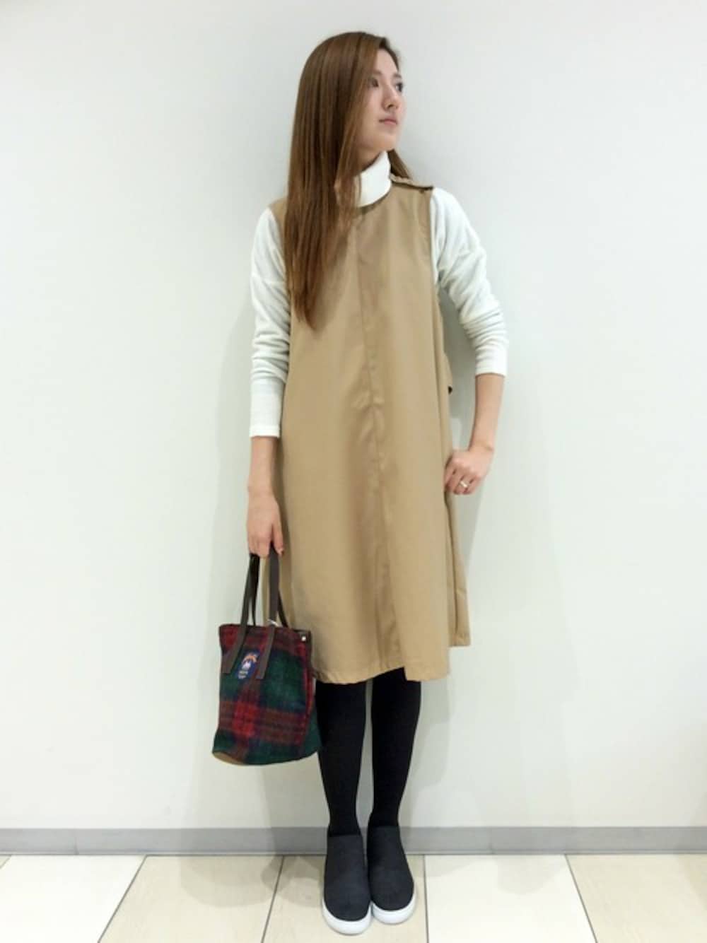 オトナかわいいワンピースコーディネートです。 ワンピースは、前からみたシンプルさとトレンチのようなバックデザインが大人の女性らしい雰囲気です。 インナーはタートルネックを合わせるとバランス◎ きれいなAラインでこれからのおでかけシーズンに活躍しそうな一枚です♪
