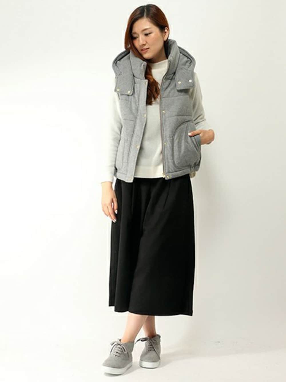 休日におすすめのラフスタイルです。 シンプルなモノトーンスタイルに、カジュアルな中綿ベストやスニーカーをあわせてカジュアルにアレンジ。 人気のガウチョパンツは、スカートのようなシルエットがポイント。あわせるアイテム次第で、通勤にも着まわせます♪