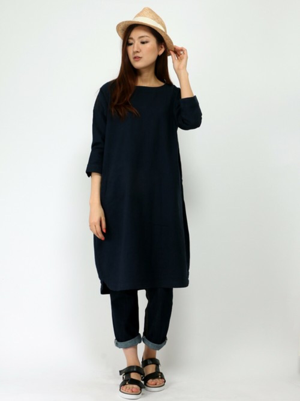人気のネイビーカラーのワントーンコーディネート。 ワンピースは、シンプルなデザインとリネンの入ったナチュラルな風合いがポイントになっています。 ネイビーだけでは、重くなりがちなので、初夏を感じさせる天然素材のハットやスポーツサンダルで合わせて抜け感をプラスしました♪