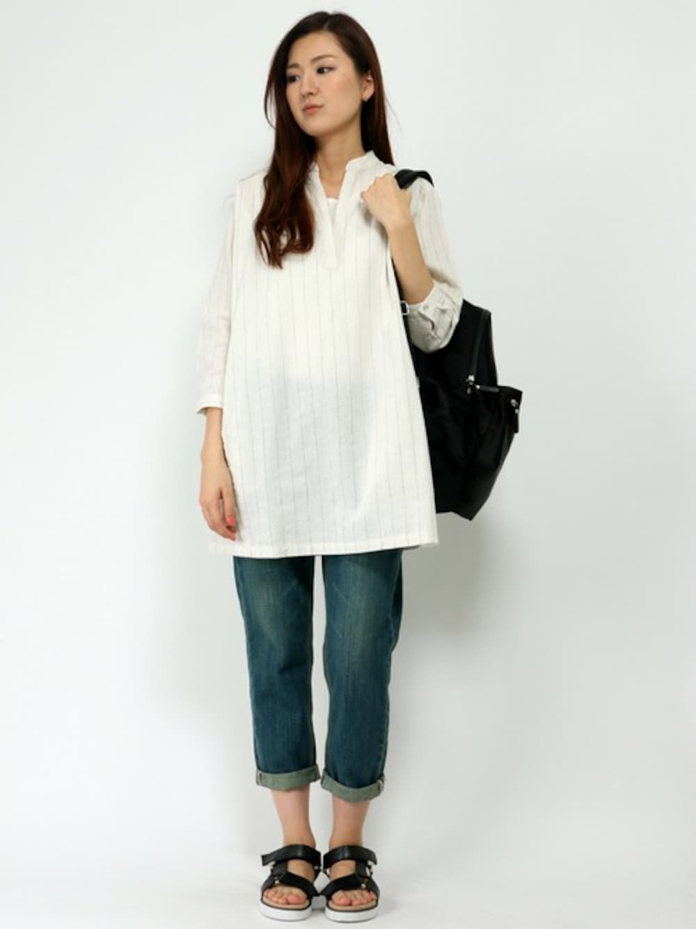 モノトーン×デニムのパンツスタイル。 リネン&コットンの天然素材のチュニックは、スキッパーネックなので、スッキリと着まわせます。 オフホワイトの柔らかい印象のトップスに、黒色のサンダル・リュックを合わせることで、ひきしめ効果◎