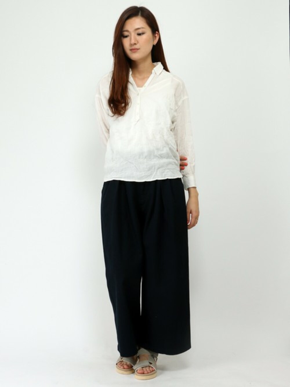 ホワイト×ネイビーのツートーンでまとめた、大人のラクチンコーディネート。 ブラウスはシンプルながら、スキッパーデザインで首まわりがスッキリし、羽織タイプとちがって女性らしい雰囲気です。 パンツは、トレンドのワイドシルエット。 爽やかなカラーリングで、夏まで活躍しそうです♪