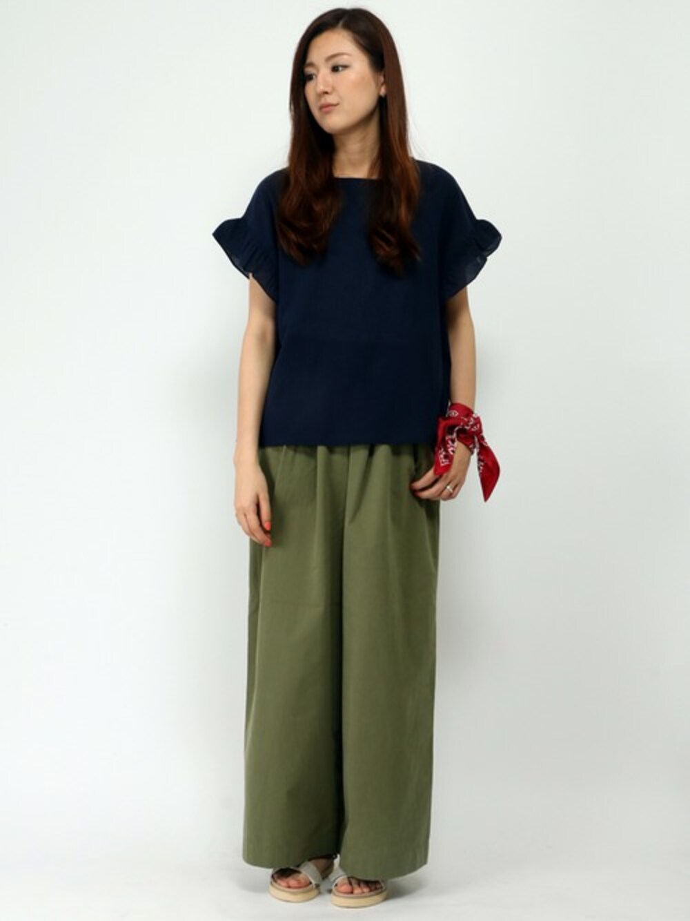 フリルブラウスとワイドパンツを使った、フェミニンコーディネート。 トップスの女性らしいフリルにボリューム感のあるワイドパンツを合わせ、ふんわりとしたシルエットに。 ネイビー×カーキの相性抜群な組み合わせに、プラスで赤のバンダナをアクセントカラーにしました。 バンダナスカーフは、手首やバッグにつけるだけで今年らしさがUPします♪