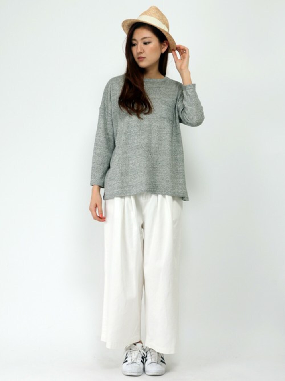 ホワイトのワイドパンツを使った、爽やかリラックスコーディネート。 ふんわりとしたシルエットが自慢のワイドパンツ。ボリュームを楽しめる今年らしいデザインになってます。 ホワイトとの相性がよいグレーの無地Tシャツを合わせ、ツートーンでまとめてみました。 中折れハットは、初夏の要素をプラスしてくれるので、これからの季節にオススメです。