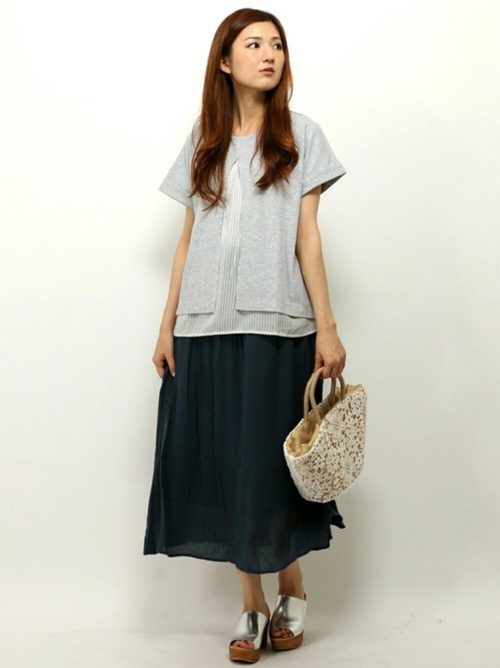 夏のお出かけコーディネート。 ふんわりギャザースカートで軽やかな雰囲気が◎ シンプルなフロントシャンのプルオーバーを合わせカジュアルスタイルにしてみました♪ シルバーのサンダルがアクセントになってます。