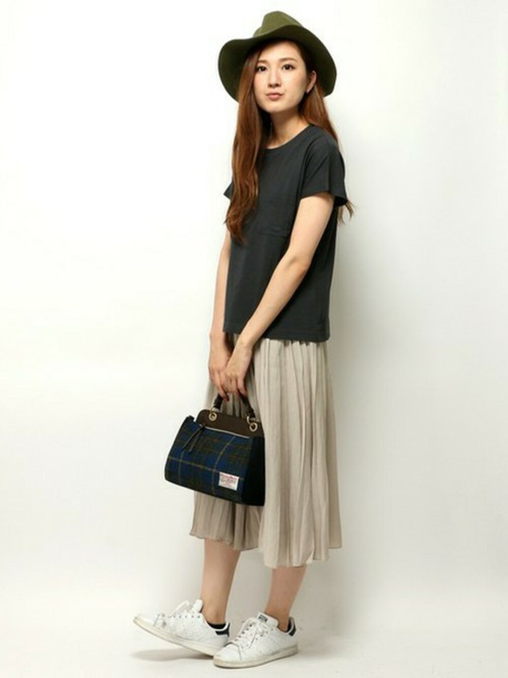 シンプルな無地Tシャツを使ったコーディネート。 プリーツスカートを合わせ女性らしさ◎ ハット・バッグを秋素材にして秋の要素をプラスしてみました♪
