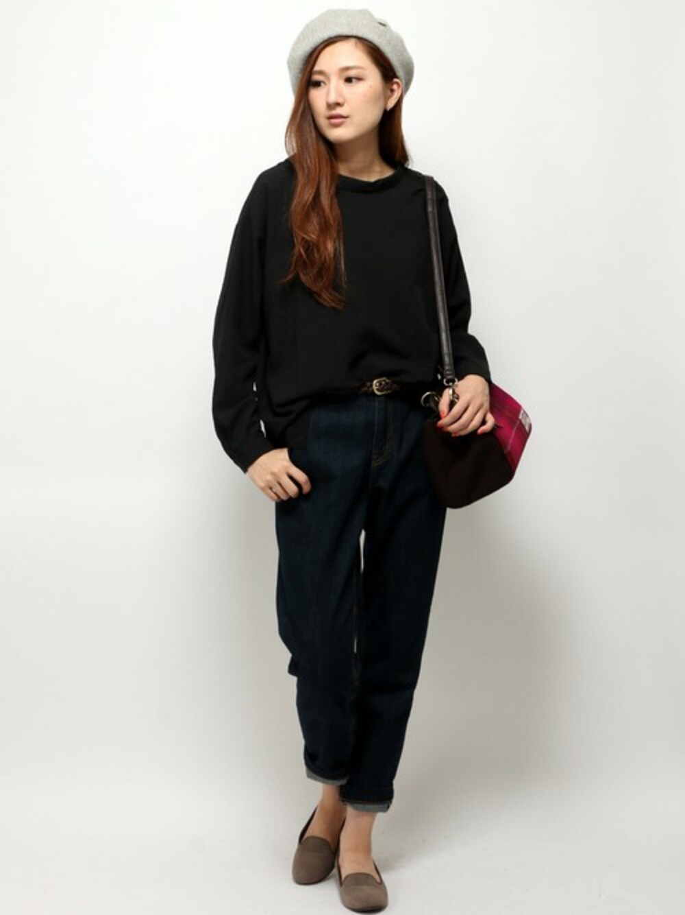 大人のおでかけデニムスタイルです。 トップスは、ハイネックのようなロールカラーで、少しヌケ感のある衿元に仕上がったブラウス。 トレンドの前後差のある着丈で、前だけトップスインすると今年らしさ◎ 小物は、ベレーとハリスツイードのショルダーをあわせて秋らしくまとめてみました♪