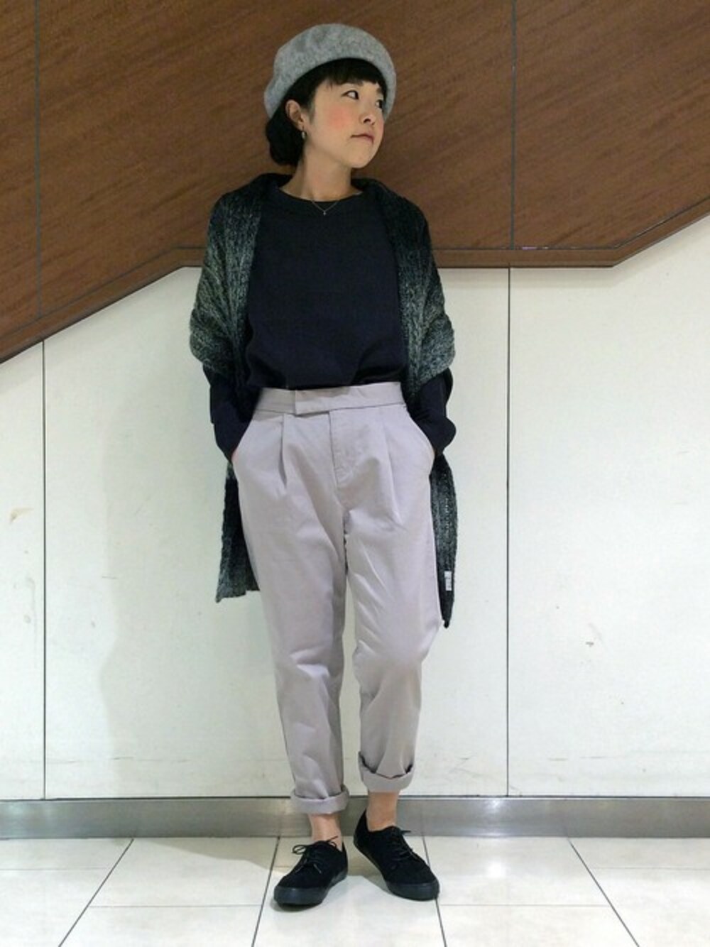 注目のカラー「黒」を中心にモノトーンコーディネート。 ケーブル編みのマフラーやレース使いのトップスを使い、モノトーンの中に柔らかさをプラスしました。