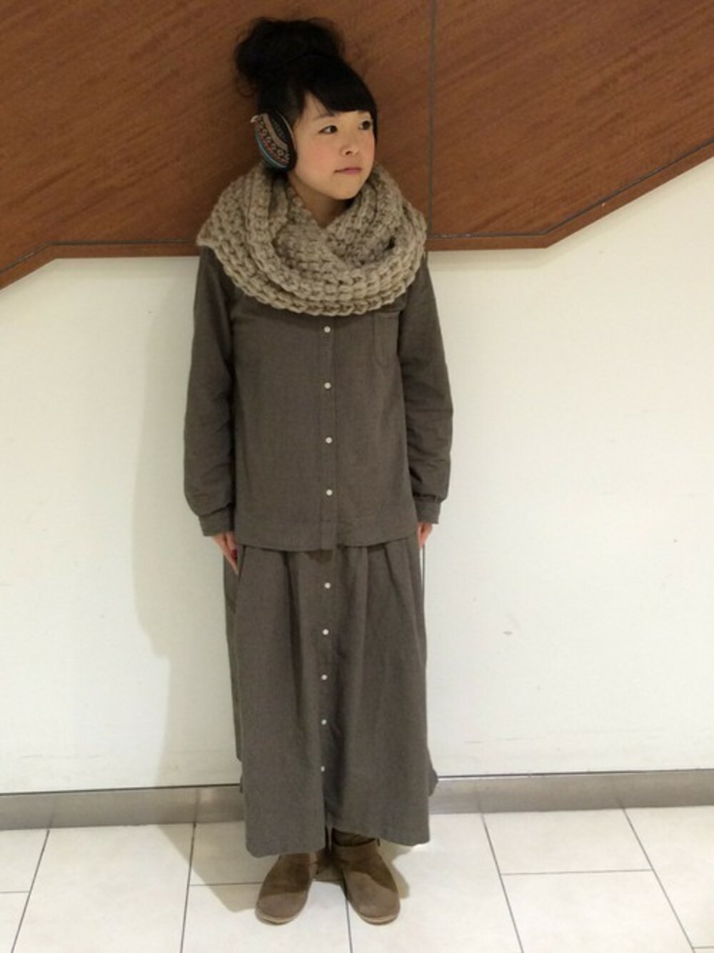 セットアップ風のデザインが効いたシャツワンピースを主役にしたスタイリングです。 着丈が長めなのに加えて、ストライプなので、ゆったりサイズでもすっきり見えるのが特徴的。 スヌードとイヤーマフラーで重心を上にもってきた点がポイントです。