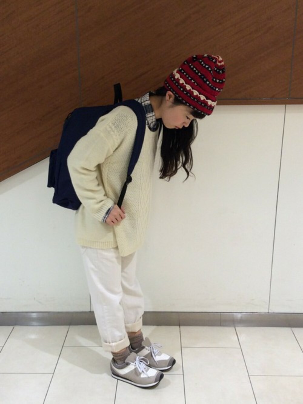重いカラーが多くなる冬に映える上下ホワイトのスタイリング。 一見難しそうに見えるコーディネートですが、モノトーンカラーをポイント使いすれば上手くまとまります。 今回はインナーのシャツやスニーカーでグレーを。バックパックでブラックを取り込みました。