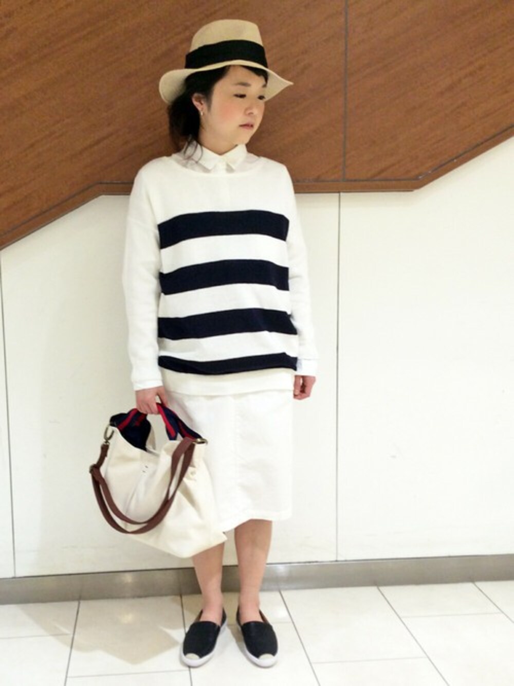 ボーダーアイテムを使ったキレイめカジュアルマリンコーディネート。 ホワイトメインのコーディネートはタイトなサイジングだとキメキメ過ぎて堅苦しくなりますので、少しゆったりサイズに。 ハットとスリッポンのカラーの面積をボーダーのピッチと合わせてバランスをとりました。