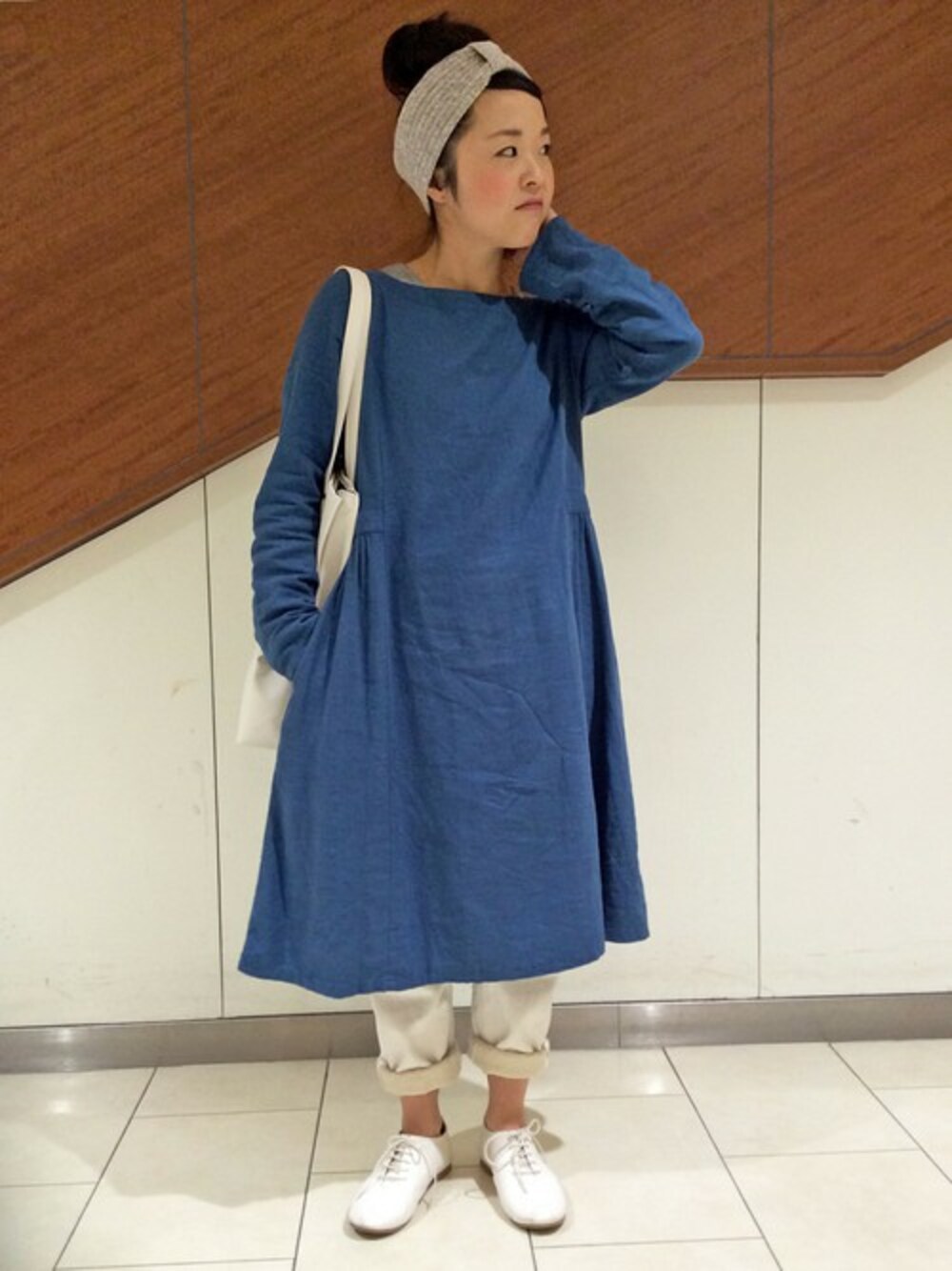 鮮やかなブルーのワンピースは、リネン素材で風合いゆたか。 ノーカラーデザインは、デコルテ見せでフェミニンな印象。 小物はトレンドのオールホワイトで、ワンピースのカラーを強調しました。