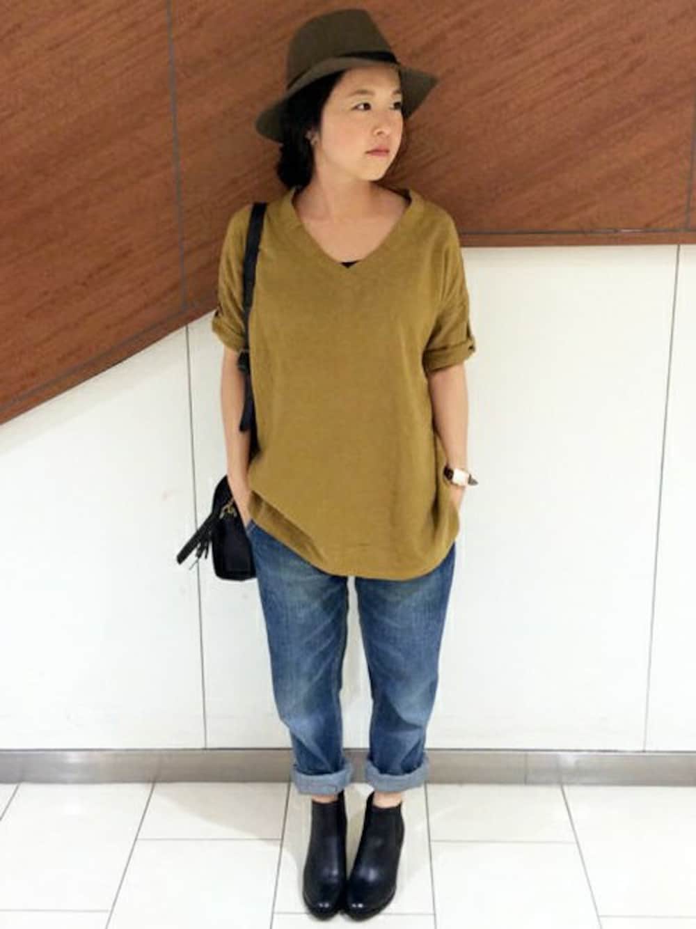 秋におすすめのデニムコーディネートです。 きれいなマスタードカラーのチュニックは、大きめVネックで鎖骨ラインがきれいに見えます。 シンプルなのでインナーや小物で着まわしアレンジも豊富な一枚です。 すこしゆるめのデニムパンツとラフにあわせて抜け感をプラス。 バッグとシューズは、黒で全体を引き締めるのがポイントです♪